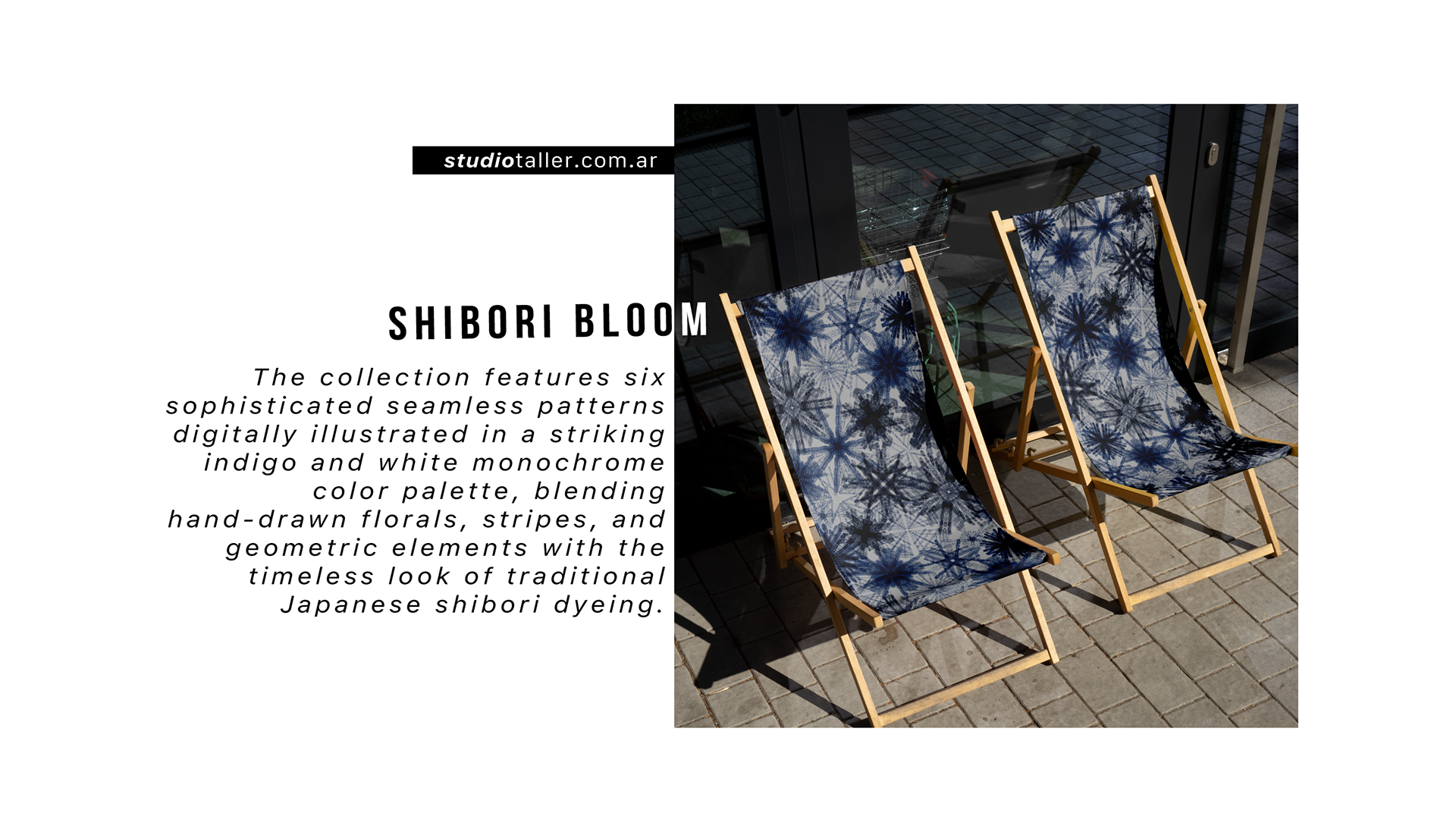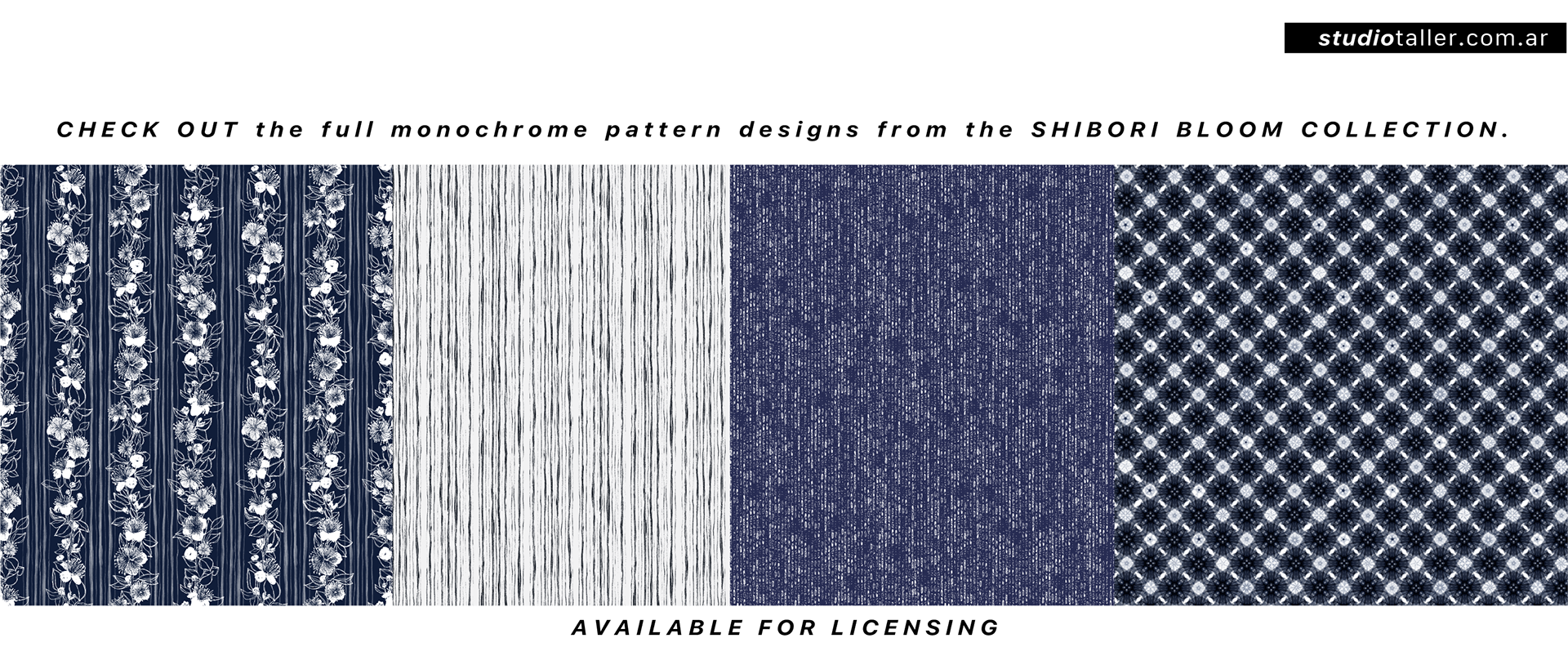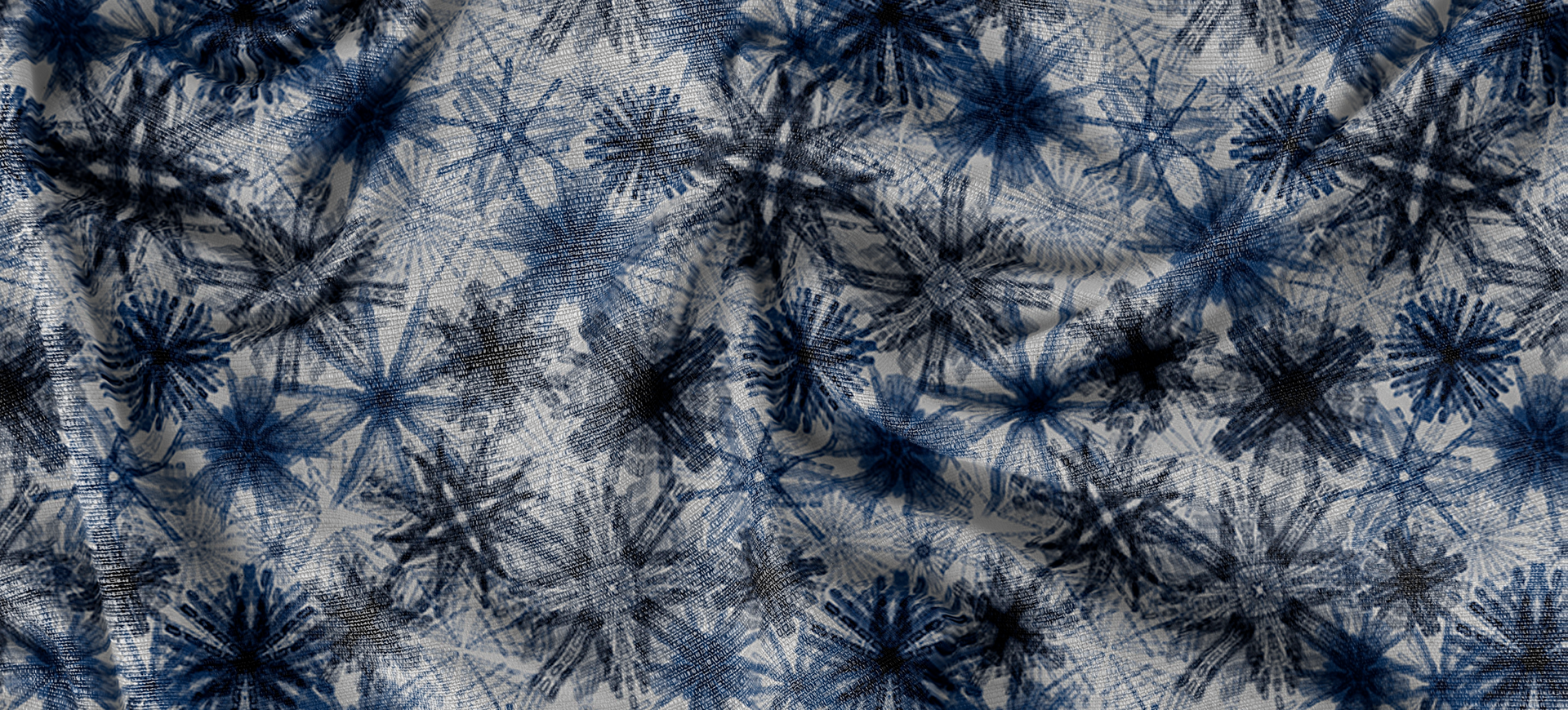 Part of the Shibori Bloom collection, this seamless pattern is a sophisticated large-scale print that uses geometric shapes to recreate the look of indigo batik and shibori hand-printing techniques.