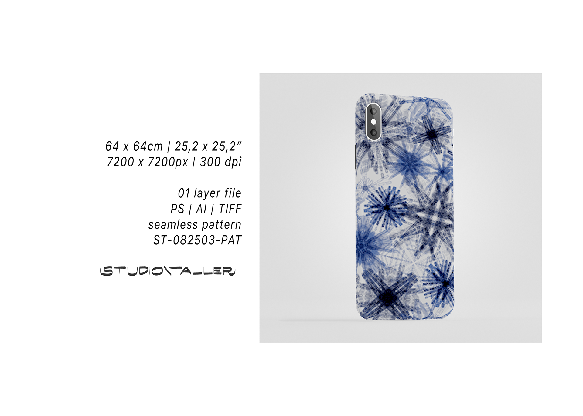 The design features a striking mandala layout in a crisp blue and white monochrome, digitally illustrated with custom brushes. This versatile print is ideal for stationary, textiles and bedding, making it a perfect asset for licensing in the home decor market.